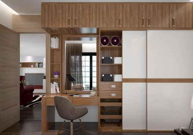 木質紋理與亞光白門板的搭配,簡約清新。衣柜與梳妝臺一體化定制,更加美觀,功能更加豐富。