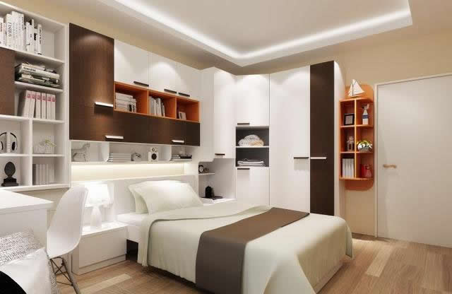 白色門板清新優(yōu)雅,與深色胡桃木碰撞出不一樣的視覺享受,且更顯時尚大方;一門到頂式設計與房間尺寸契合,實用大氣;角落處吊柜的設計方便小件物品的拿取。
